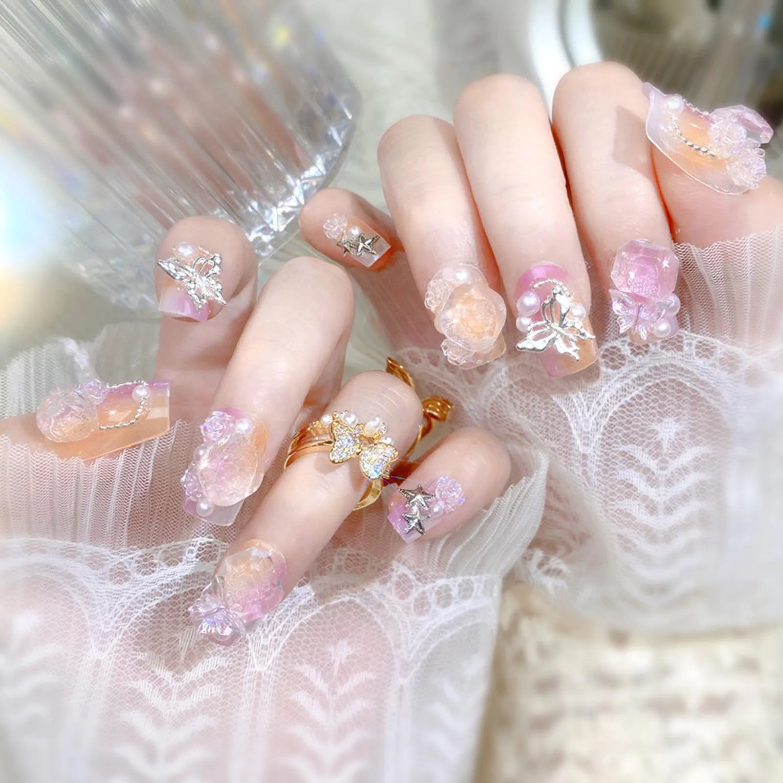 Blush Pink False Nails Bowknot Diamond Pearl 3D Design Press on Nail Tips with Harmless Smooth Edge Nails Woman DIY Fake Nails
